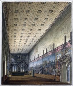 Following the glory days of the high medieval period and the vast sums lavished on the chamber by Henry, his son and grandson, the slowly fell into neglect and the glorious wall decorations were whitewashed, or papered or covered by tapestries.   The wall paintings were only ‘rediscovered’ in 1819 and the Society of Antiquarians commissioned artist Charles Stothard to make watercolour copies of the murals – see the illustration at the top of the post.  Another amateur artist, Thomas Crofton Coker, clerk of Works at Westminser, made his own copies of the murals in watercolour which are now held at the V&A museum and the Ashmolean Museum in Oxford.