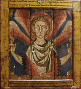 Left illustration is a seraphim ceiling panel from The Painted Chamber, discovered in 1816.  Now in the British Museum.  The right illustration depicts The Painted Chamber as a watercolour by William Capon in 1799.
