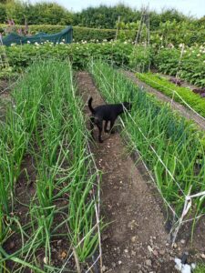 This is Ted inspecting the onions! I’ll post more photos of the other four-legged garden inspectors next time round.